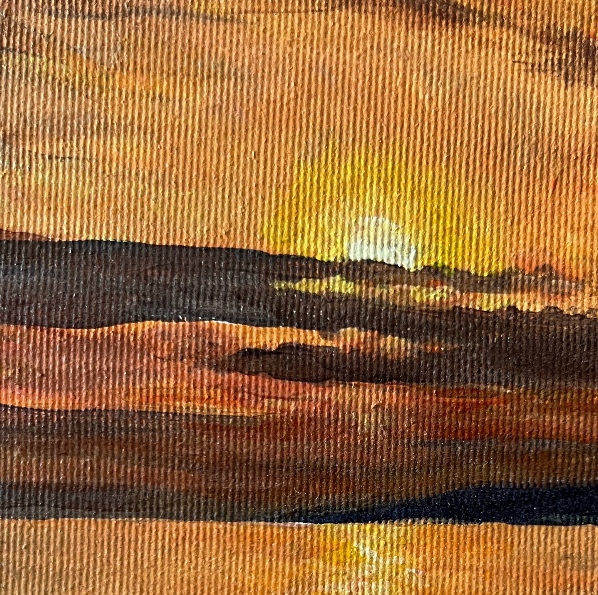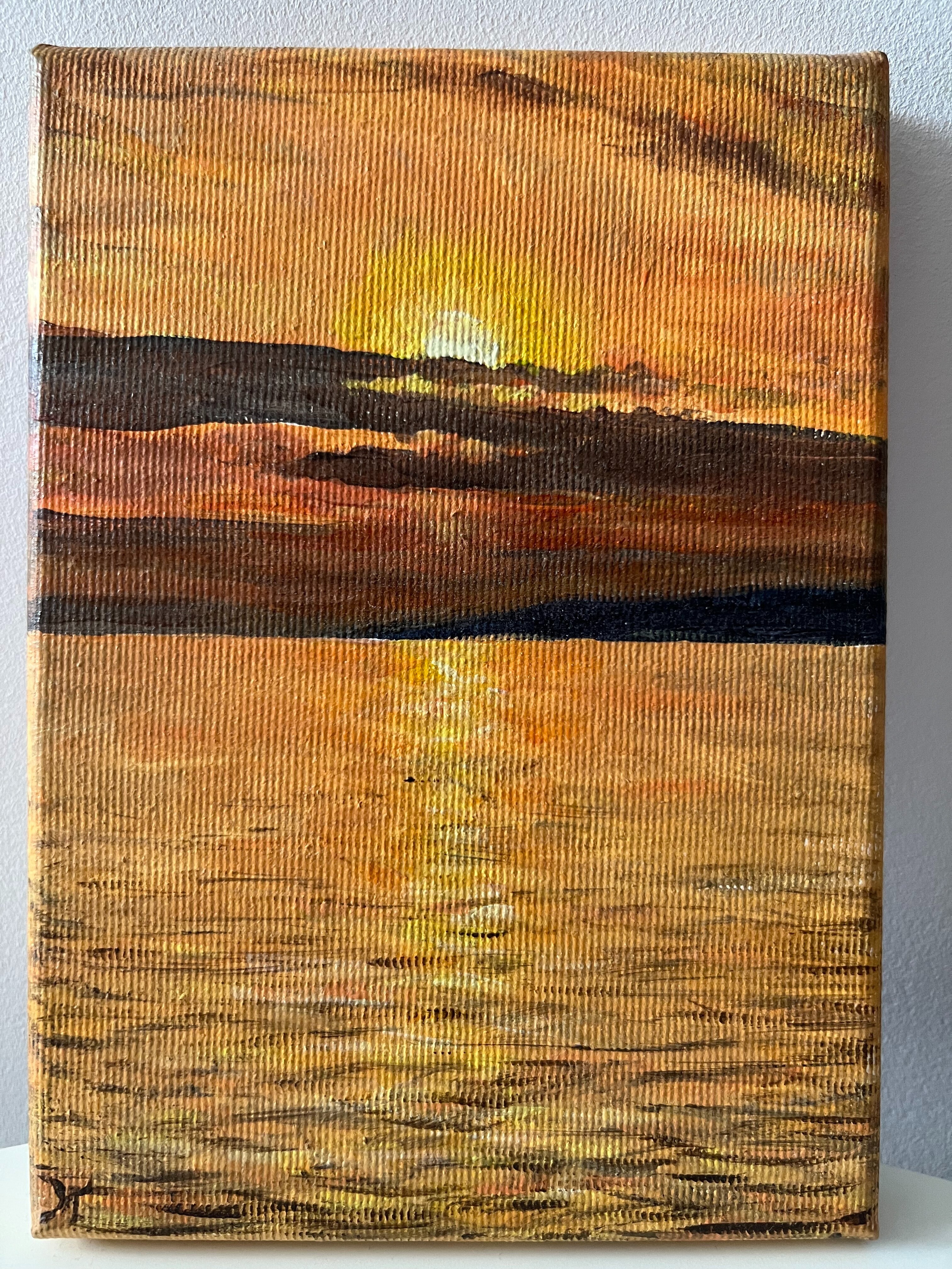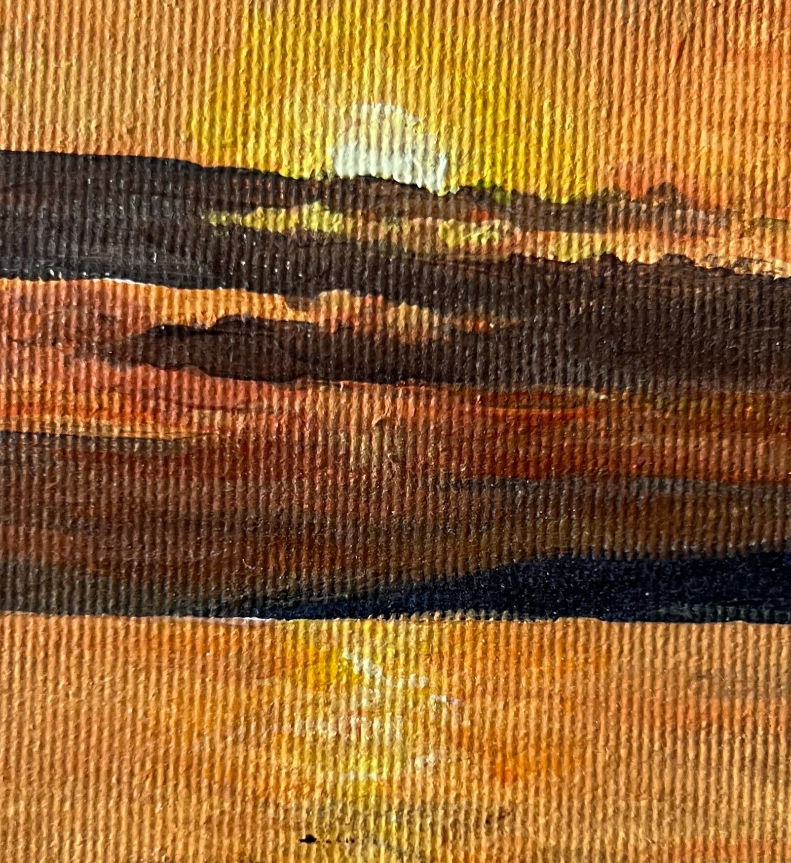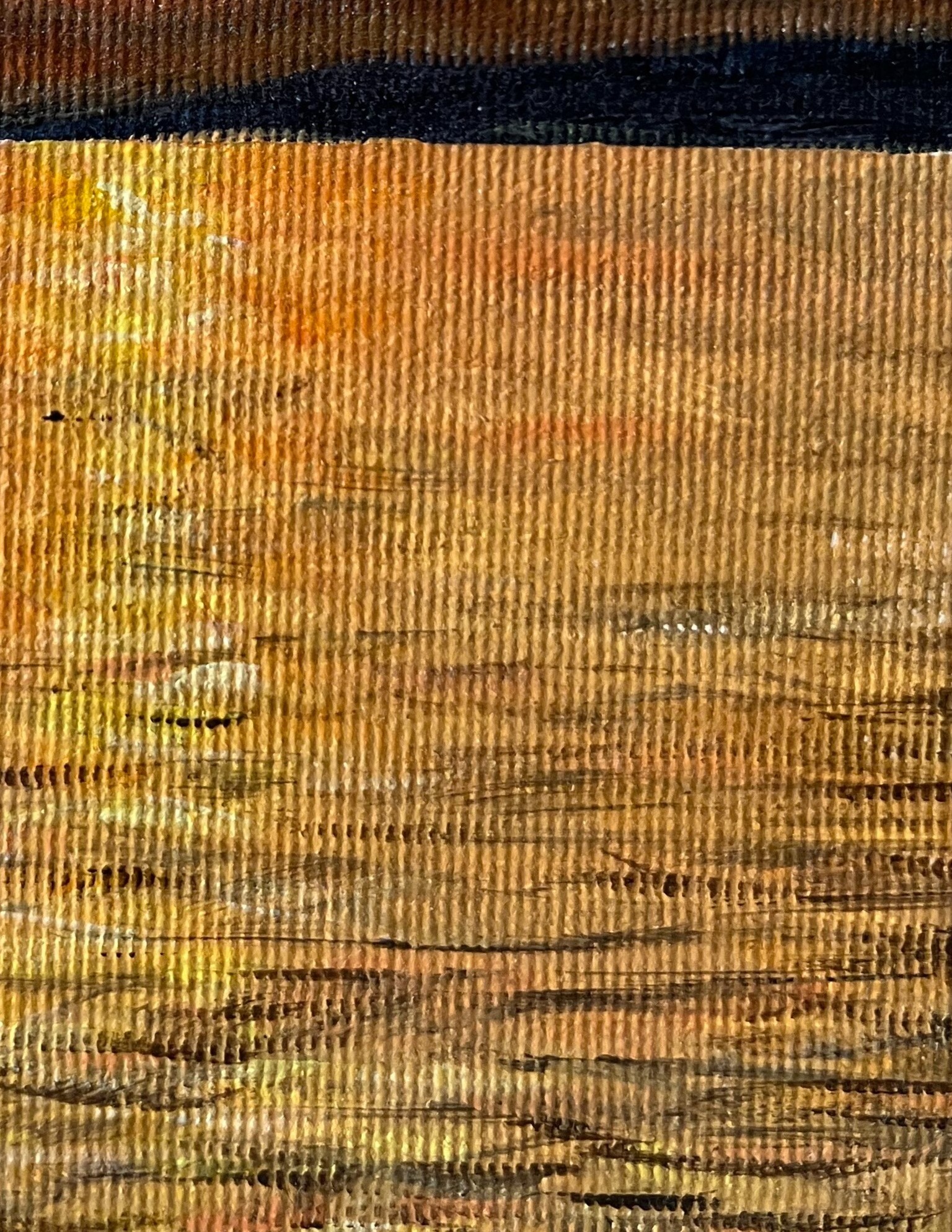 Obraz przedstawia złotą godzinę zachodu słońca. Ogniste niebo powoli gaśnie, wypala się w odcieniach bursztynu i brązu. To przemijanie dnia, przemijanie chwili.